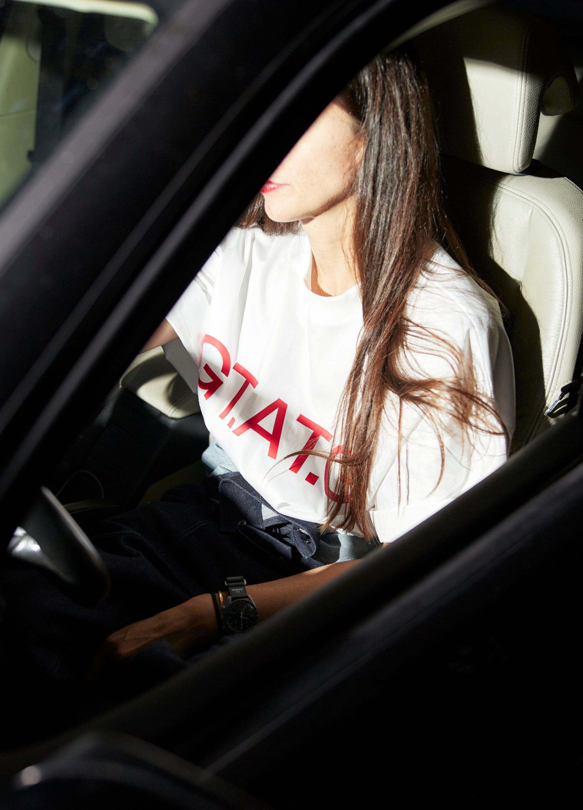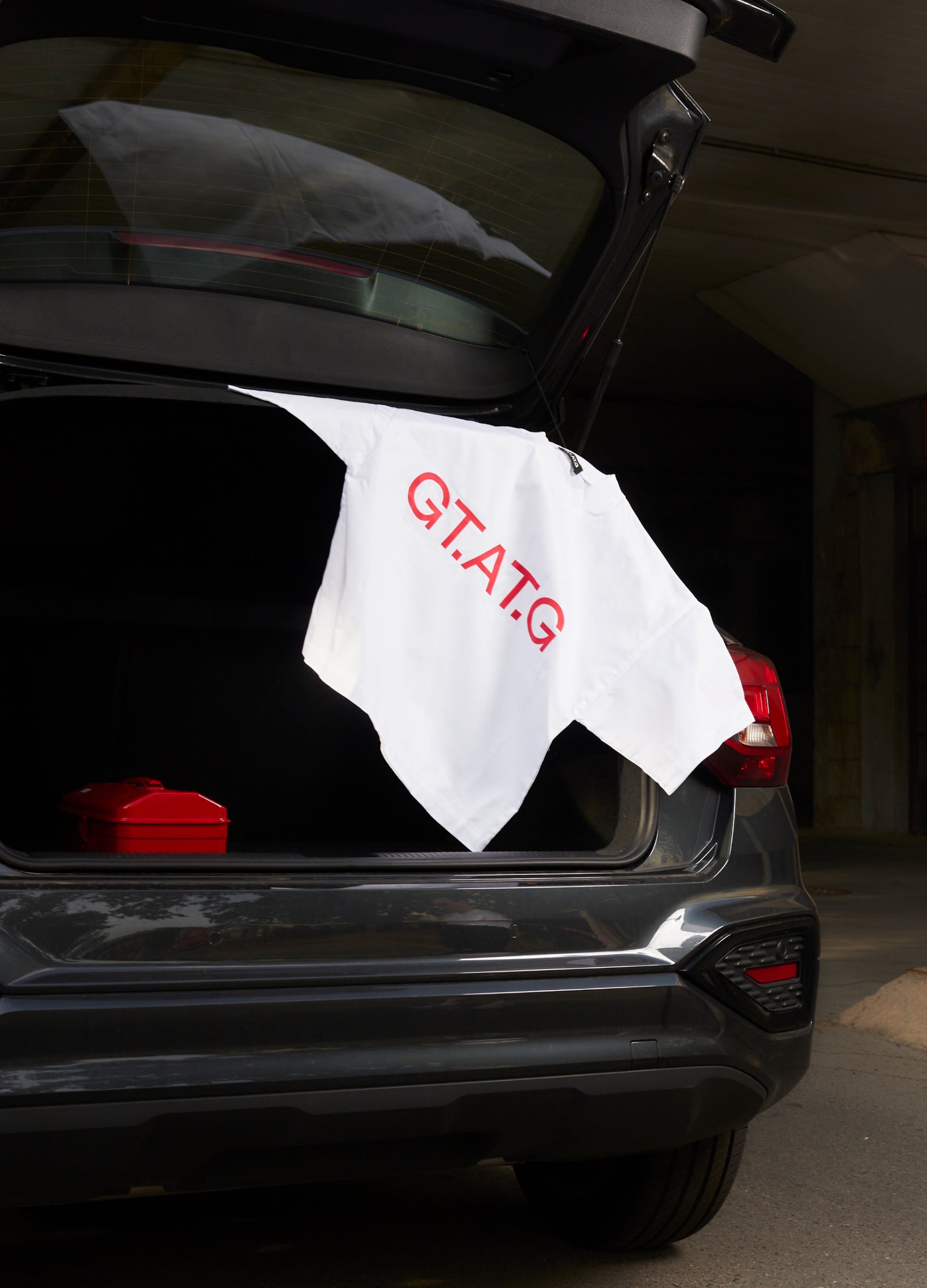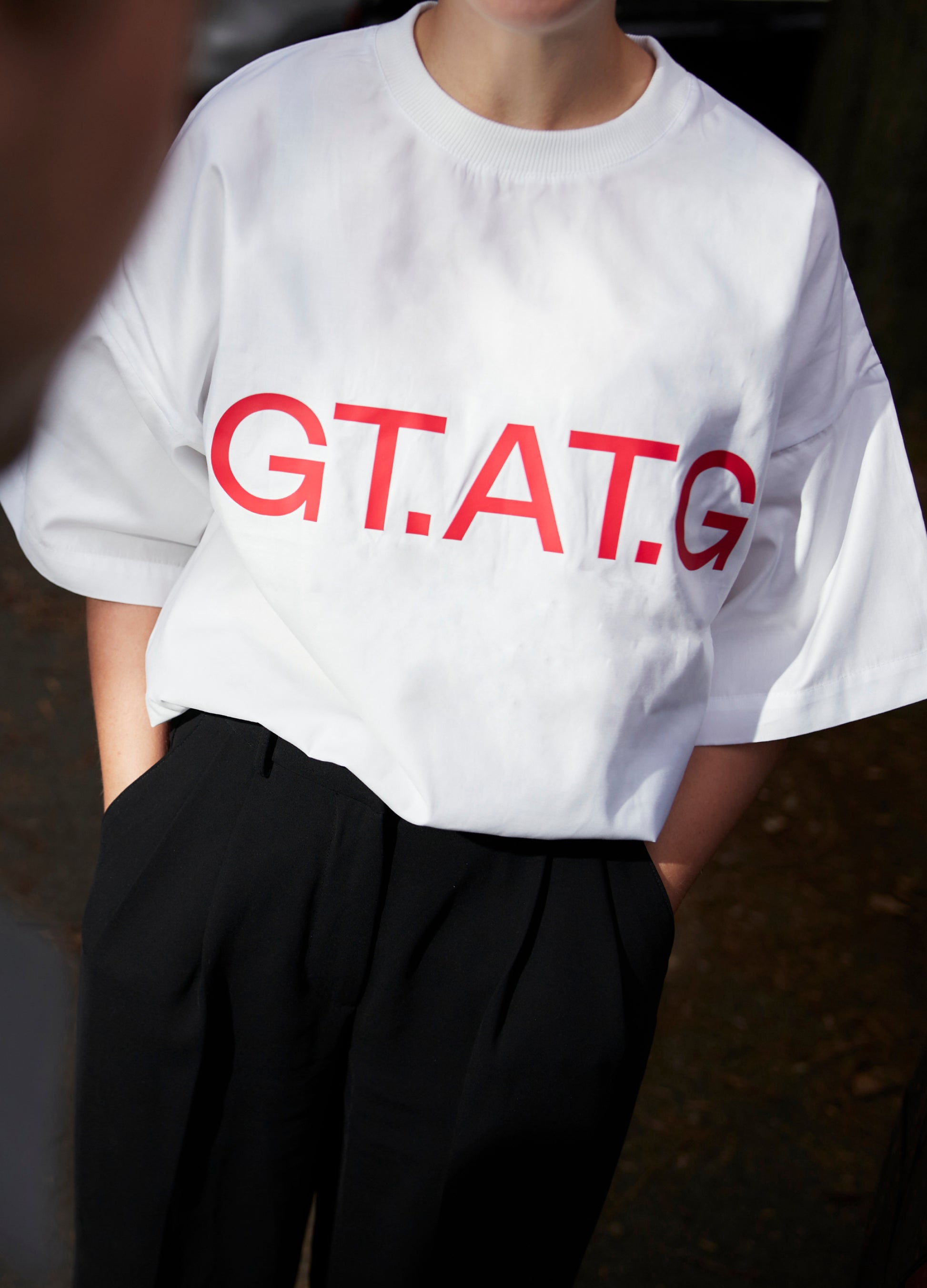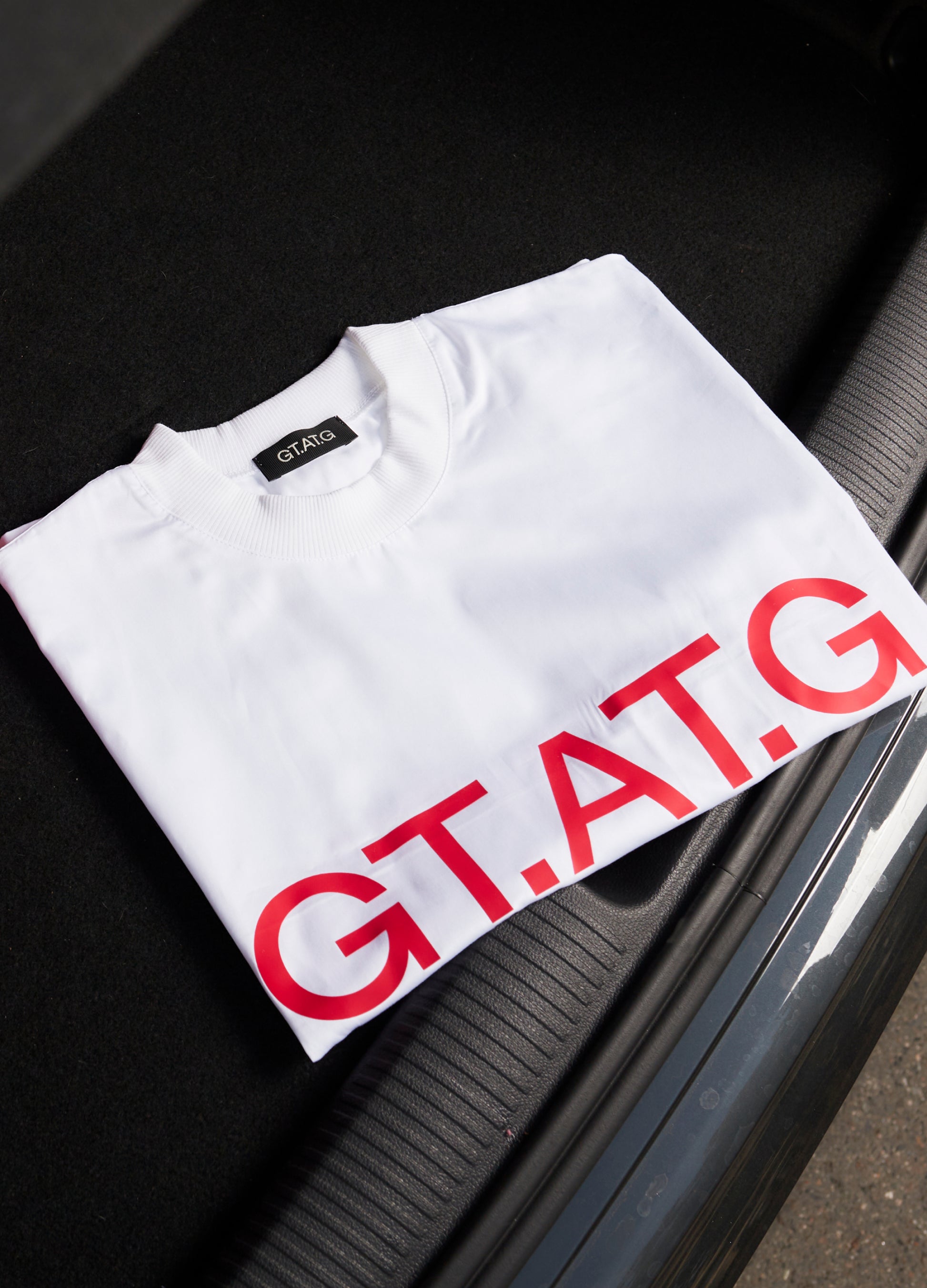Úplně první triko od GT.AT.G. Ručně šité, lehké bílé triko s červeným potiskem. Volný střih, včetně širokých rukávů. Pevný lem kolem krku. Inspirováno závodními okruhy.